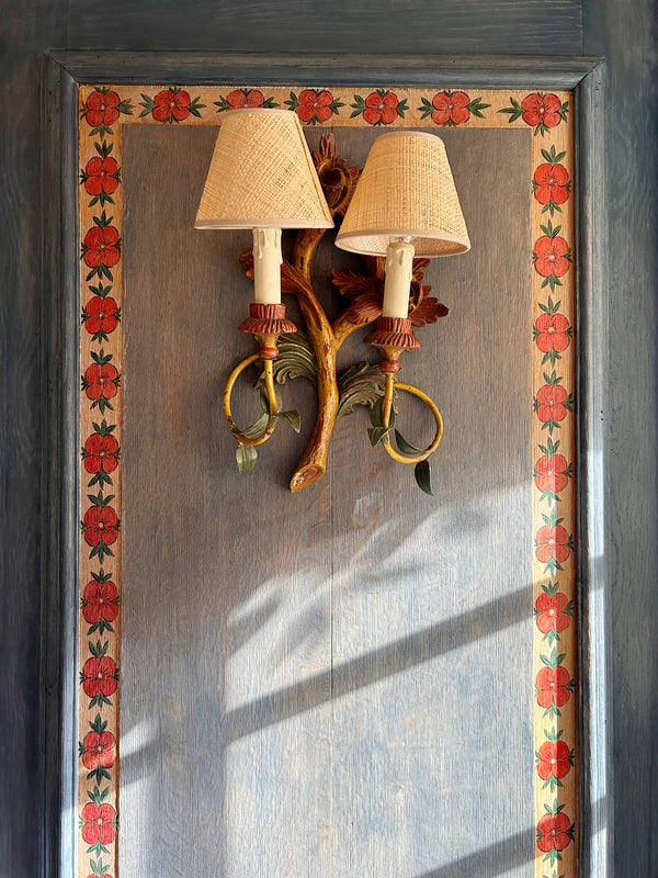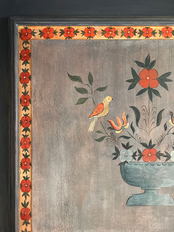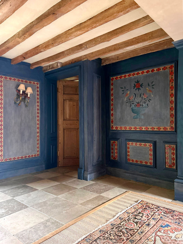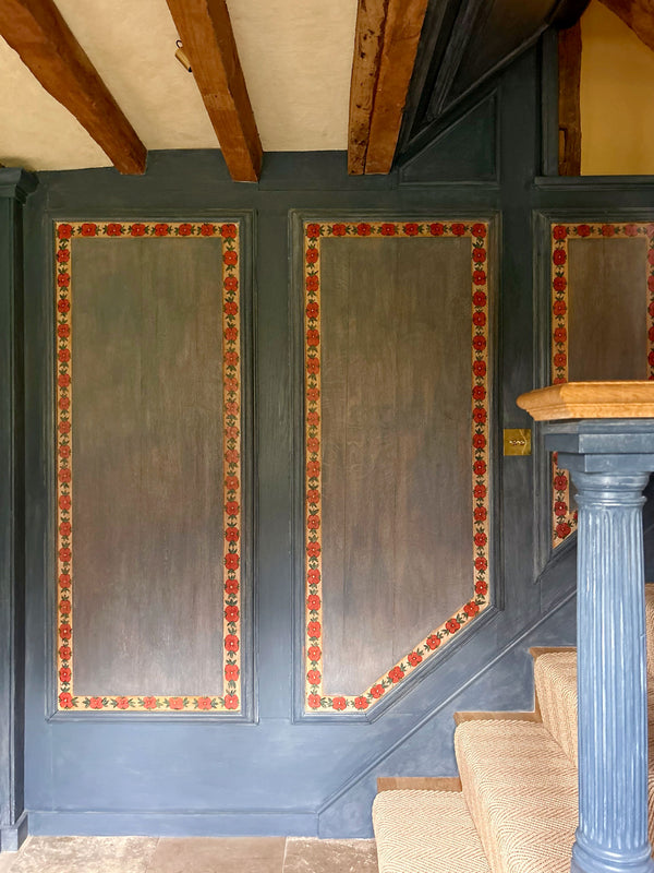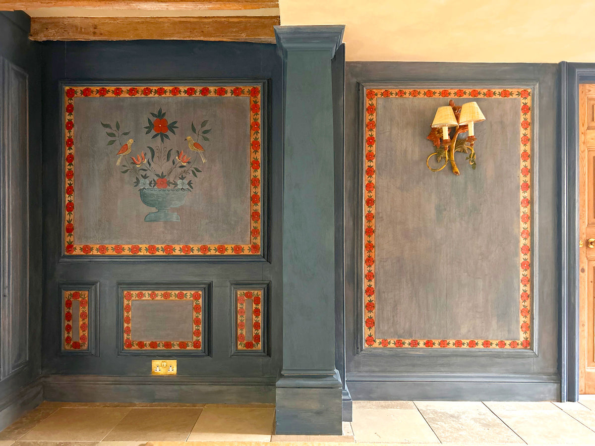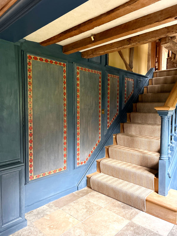 Decoration of an oak panelled hallway with a scheme inspired by Swedish folk decoration. The panelling had been installed by the previous owner, and using a washed base colour we brought out the grain of the wood whilst adding more interest and character to the space.