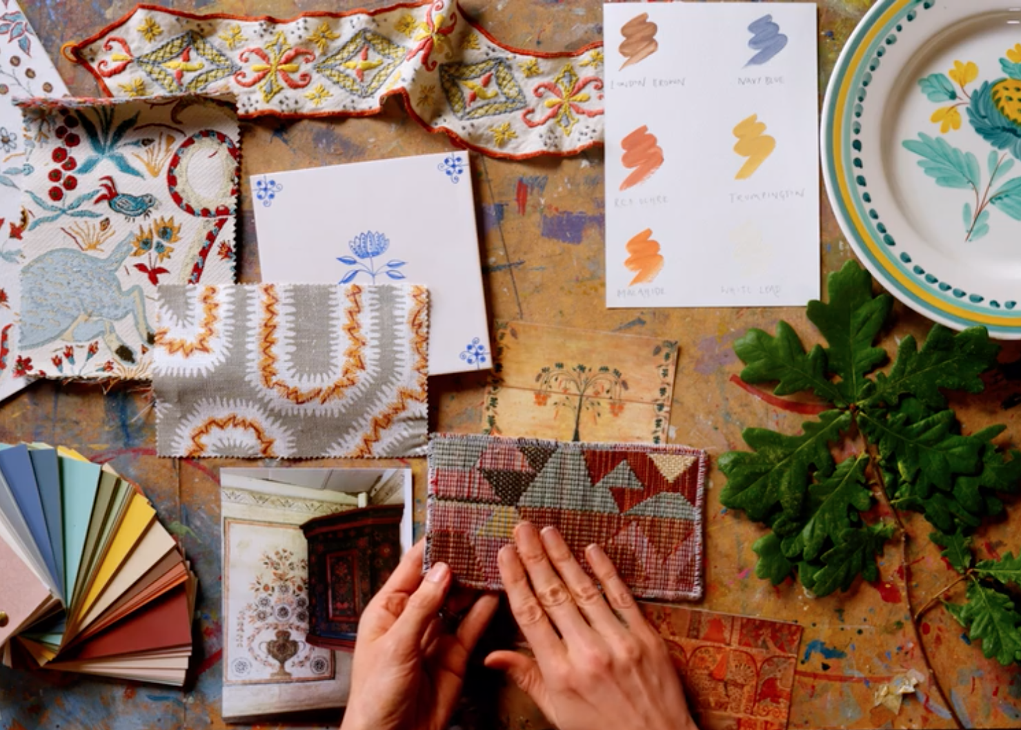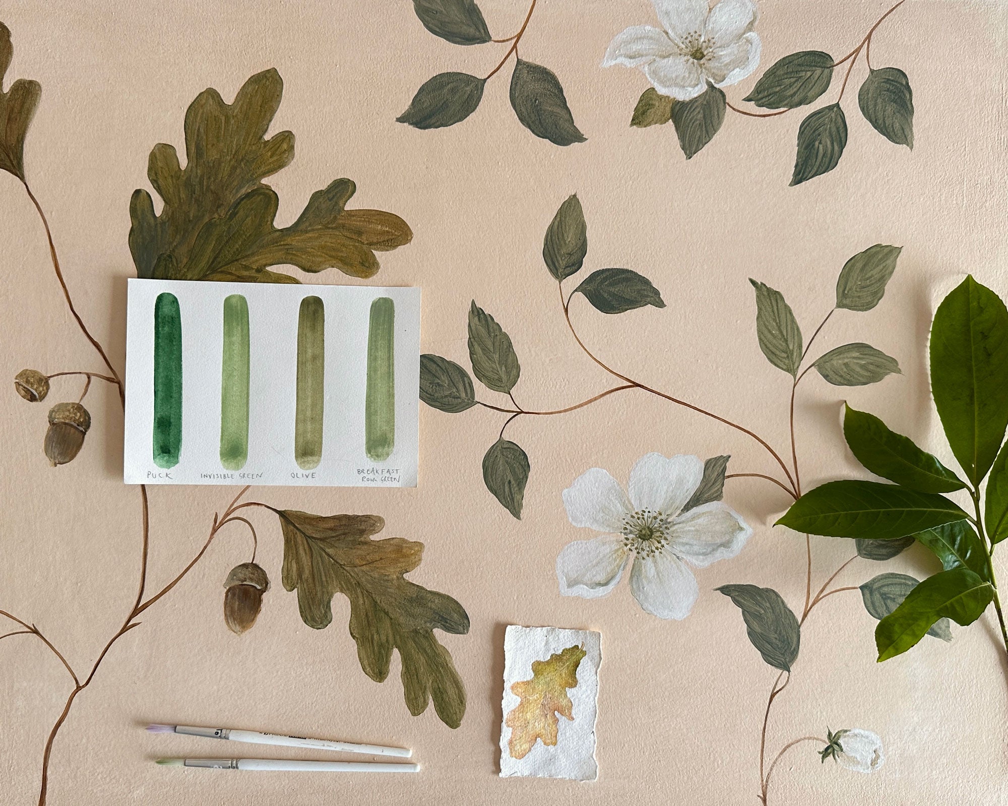 Following approval of a quote, we usually carry out a site visit as the space inevitably informs the design. We often incorporate elements from the home and surrounding garden, weaving together threads of inspiration to create a design personal to your project. We create a digital render to show our proposed design in your space, welcoming feedback on scale and density of the design. Following approval of this mock-up, we paint sample boards to agree upon the painting style, brushwork and colour palette, which can be viewed on site alongside the fabrics and furnishings of the room. Our sample boards are an invaluable part of our process, and we refer to them closely when painting the final piece.