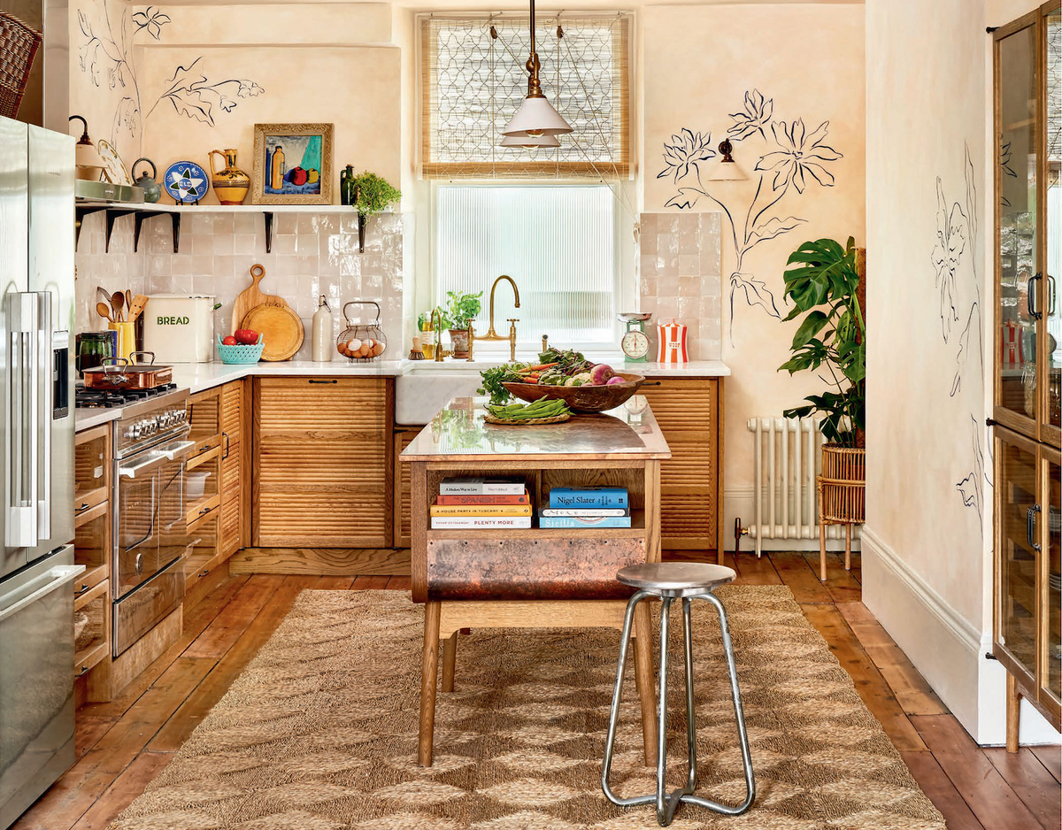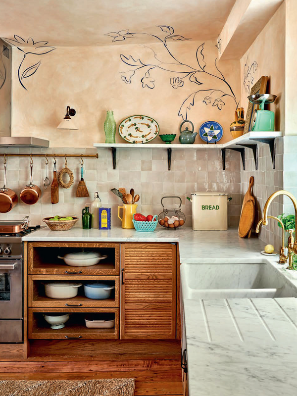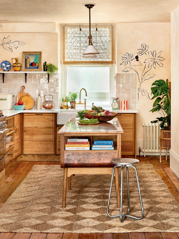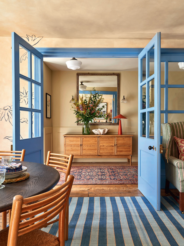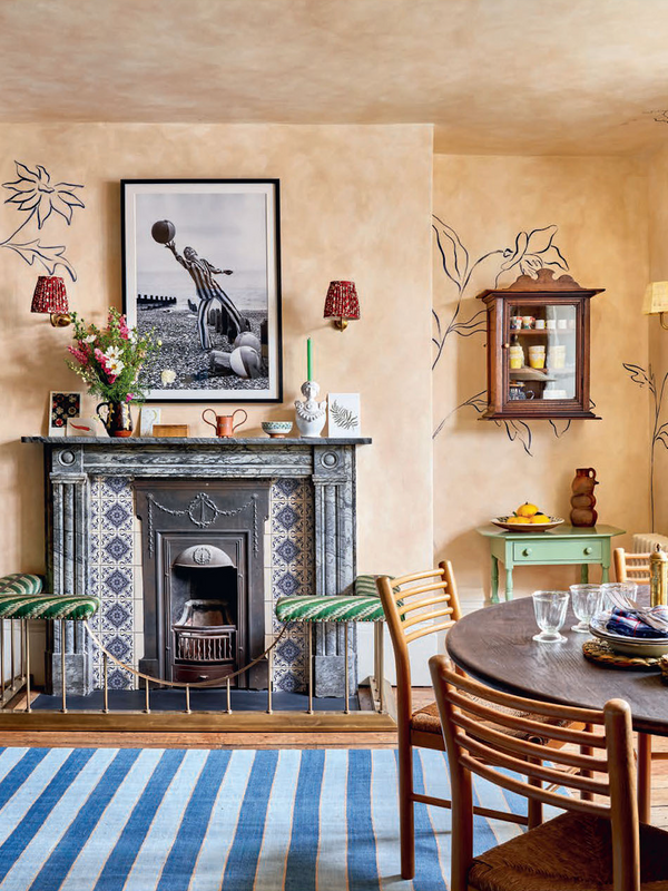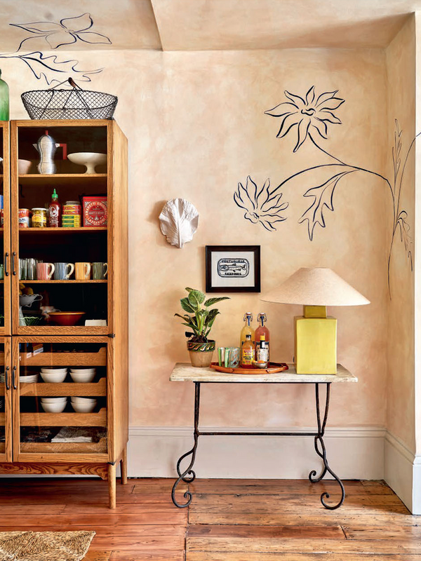Decoration of the kitchen and dining room of a Georgian bay-fronted house. Our brief was to evoke a relaxed and creative atmosphere, with loose florals sketched over a parchment texture wall wash. Inspired by Jean Cocteau's line drawings, oversized flowers sprawl across the walls and ceiling as though quickly sketched in ink.