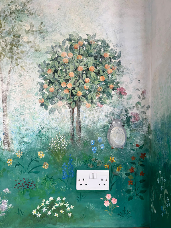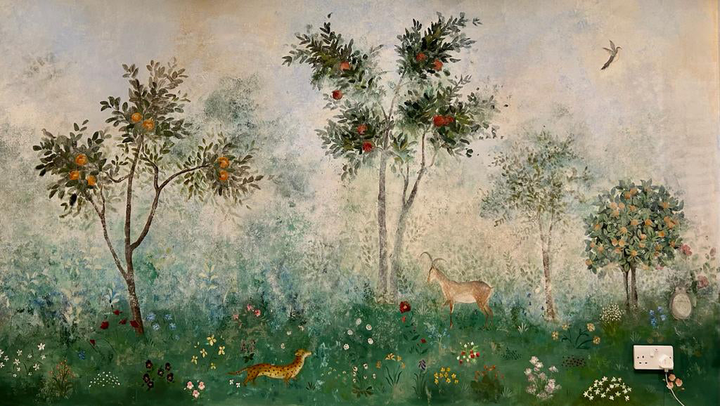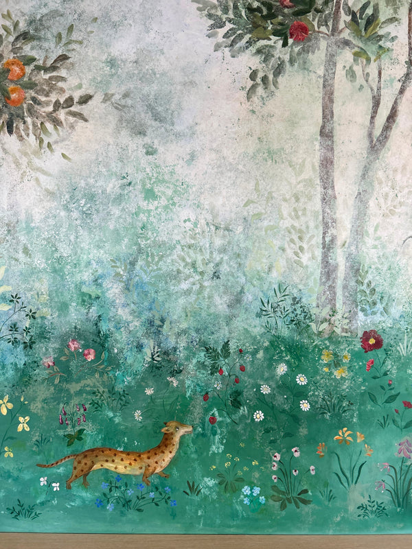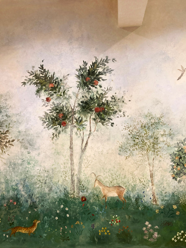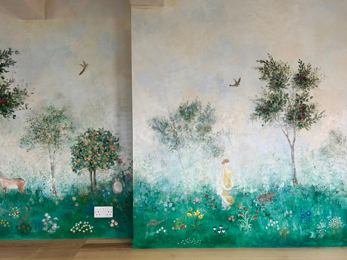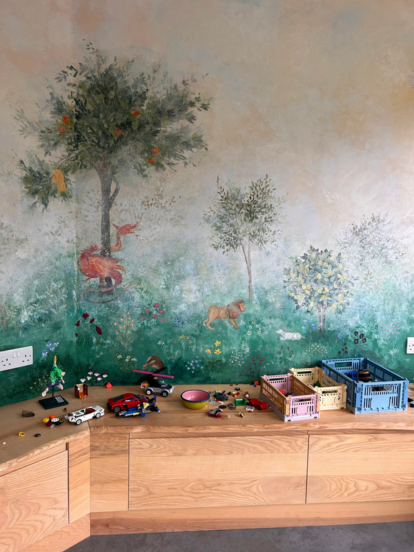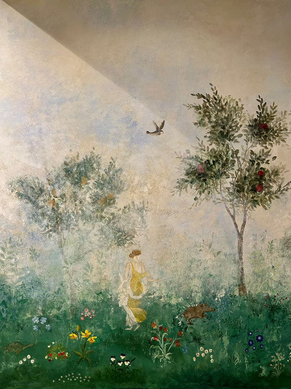 Decoration of a children’s playroom inspired by Roman frescoes and Greek mythology. Circe, Pegasus and the Colchian Dragon inhabit a verdant woodland in a sun-filled playroom which opens onto the garden.