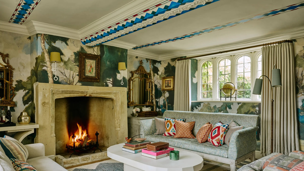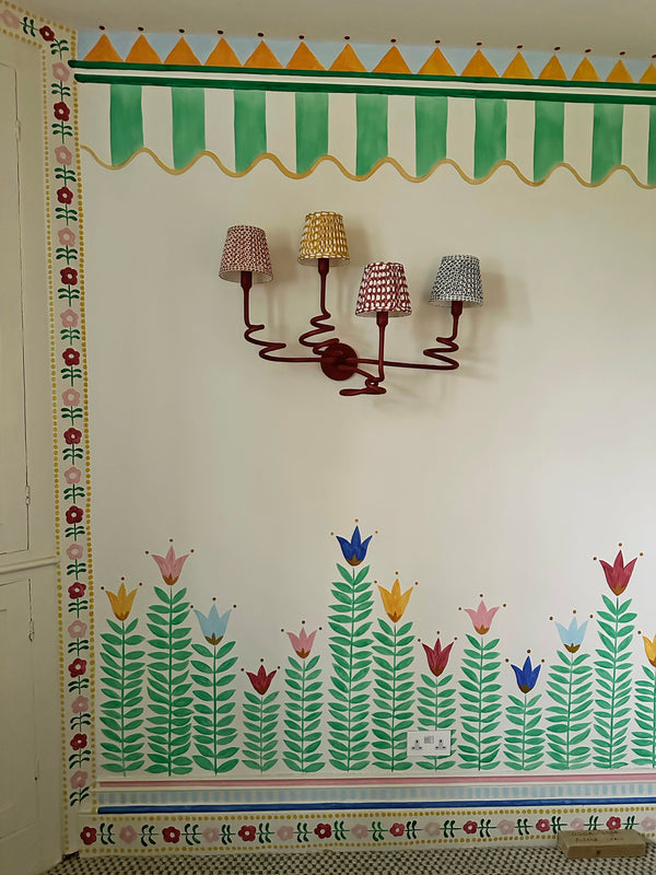 Decoration of a children's playroom and adjoining drawing room in a 16th century farmhouse. Our brief was to reflect the family's love of travelling, with explosions of colour playfully layered within the historic home. Inspired by the colourful tents of Seville's Feria festival, joyful borders run around the playroom like a Lagartera embroidery, while the drawing room beams capture the spirit of Aztec textiles. The rooms are characterful and deeply personal to the family, woven together by threads of colour and travel.