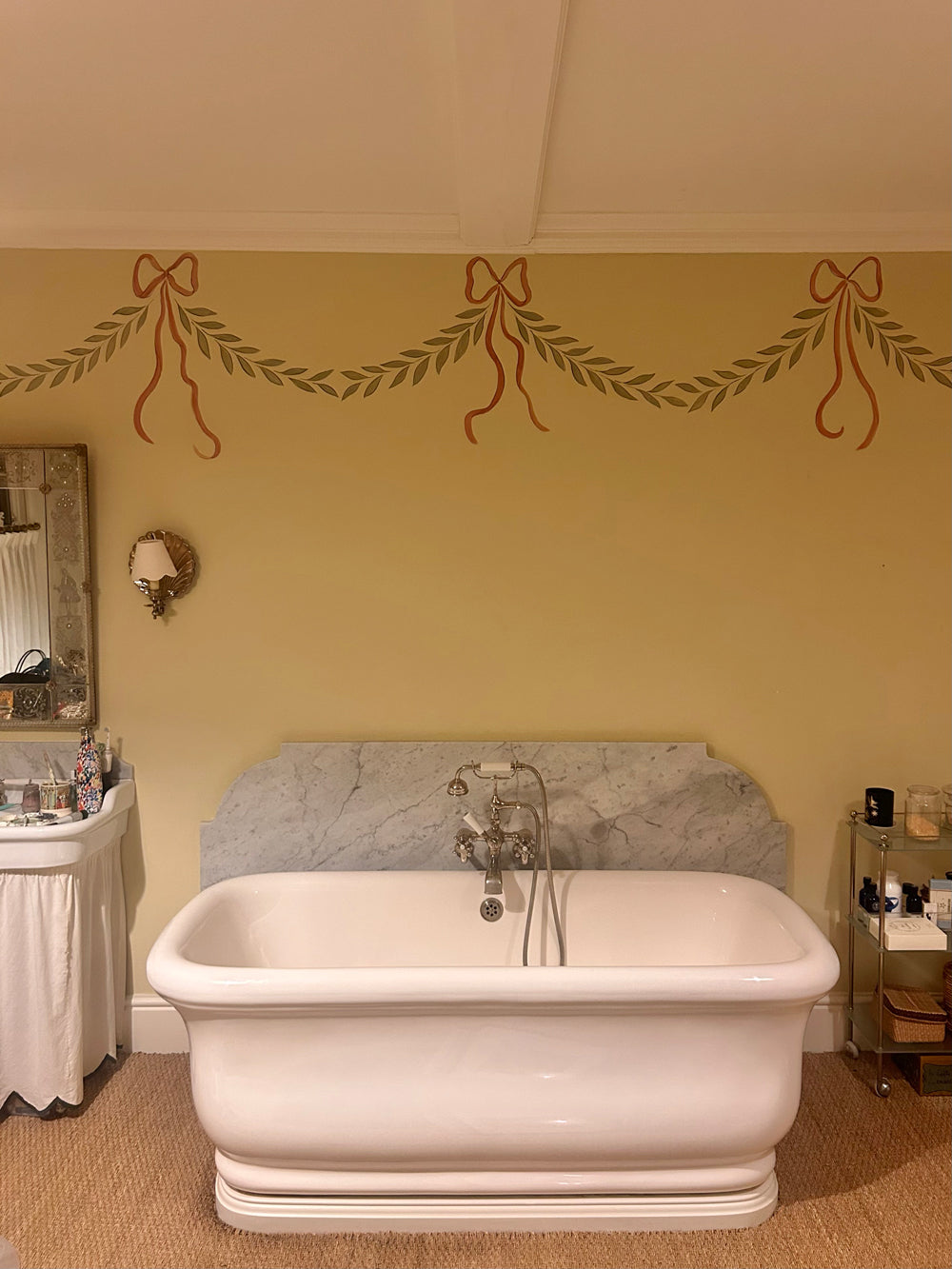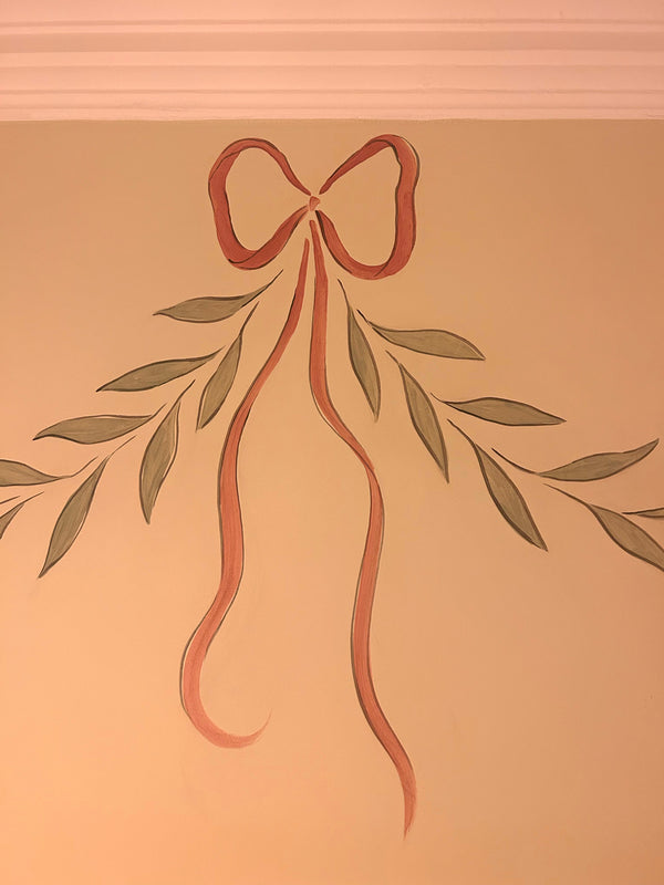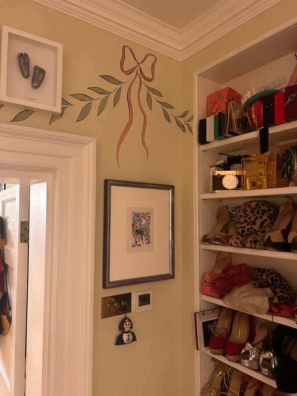 Decoration of a powder room with a border created by a loose garland of ribbons. Inspired by Karin Larsson's 19th century bedroom in Sundborn, Sweden, the border echoes the soft and romantic palette of the adjoining master bedroom. A sketchy outline to the ribbons and bows brings a contemporary twist, in a nod to the shoe designer's collection of eccentricities.