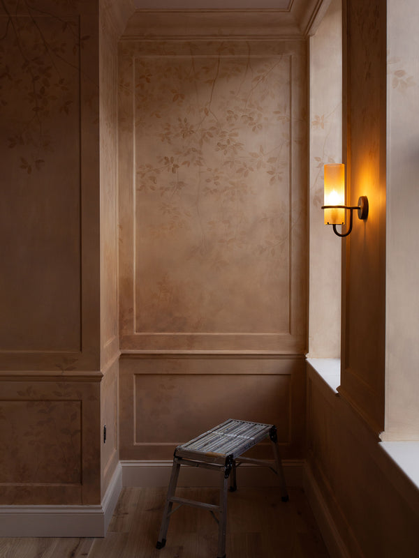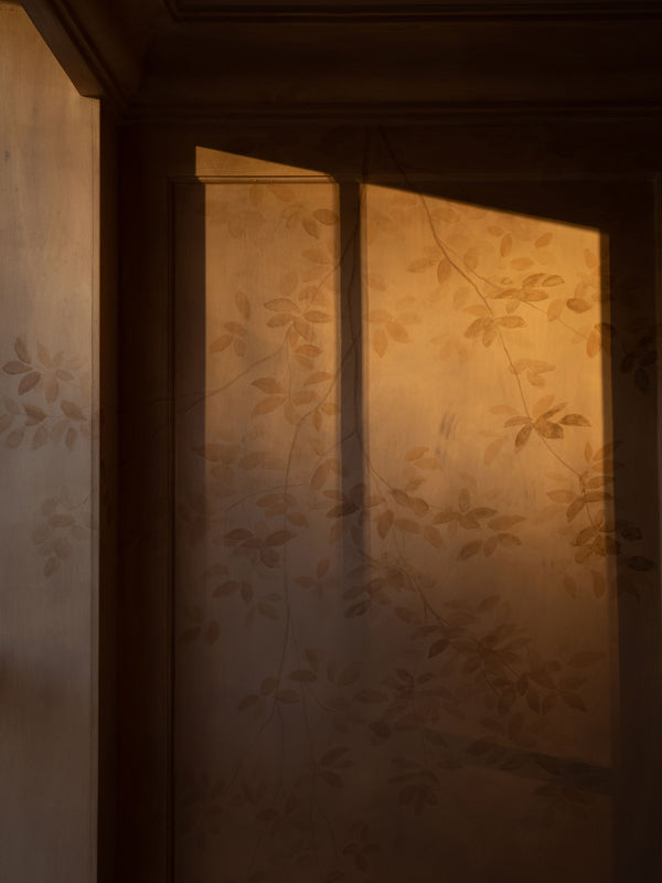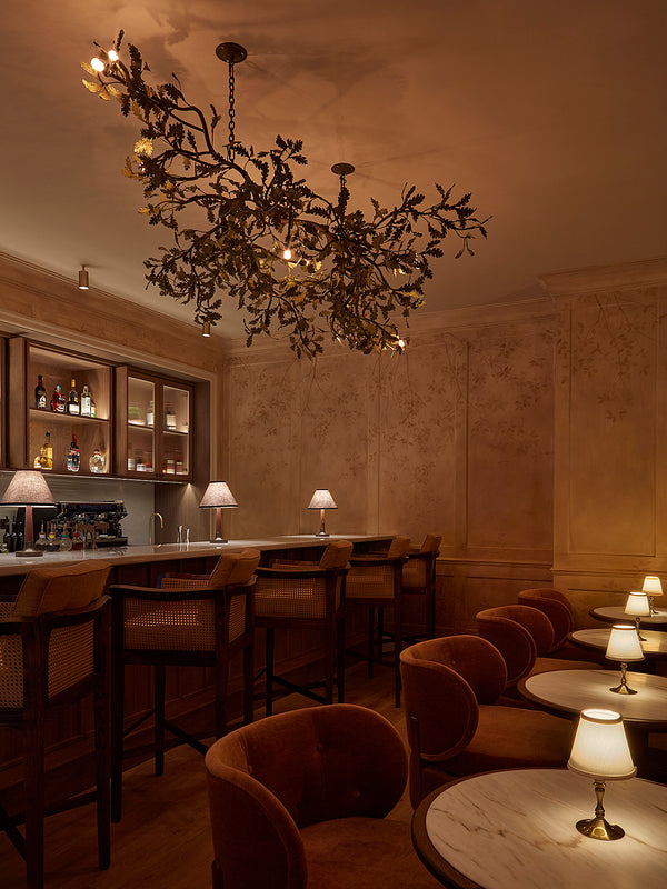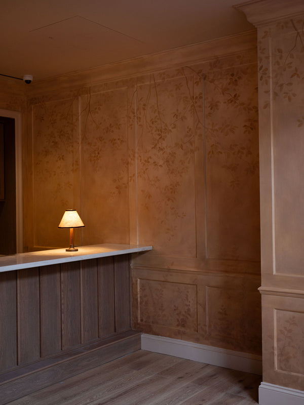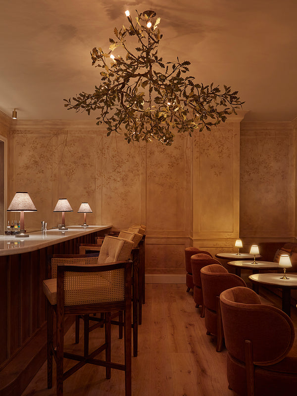 Decoration of the bar in Templeton Garden with softly layered silhouettes of leaves and branches. Our brief was to create a sophisticated tonal mural which brought nature into the space, and which created an atmosphere of understated elegance. Drawing inspiration from the foliage growing in the hotel gardens, we designed a mural which gave the feeling of being underneath a canopy of trees, implying a gentle movement of dappled sunlight filtering through branches overhead. The leaves come and go within the earthy tones of our textured wash, and the mural works beautifully with the oak leaf chandelier, light and shadow dancing across the space in unison.