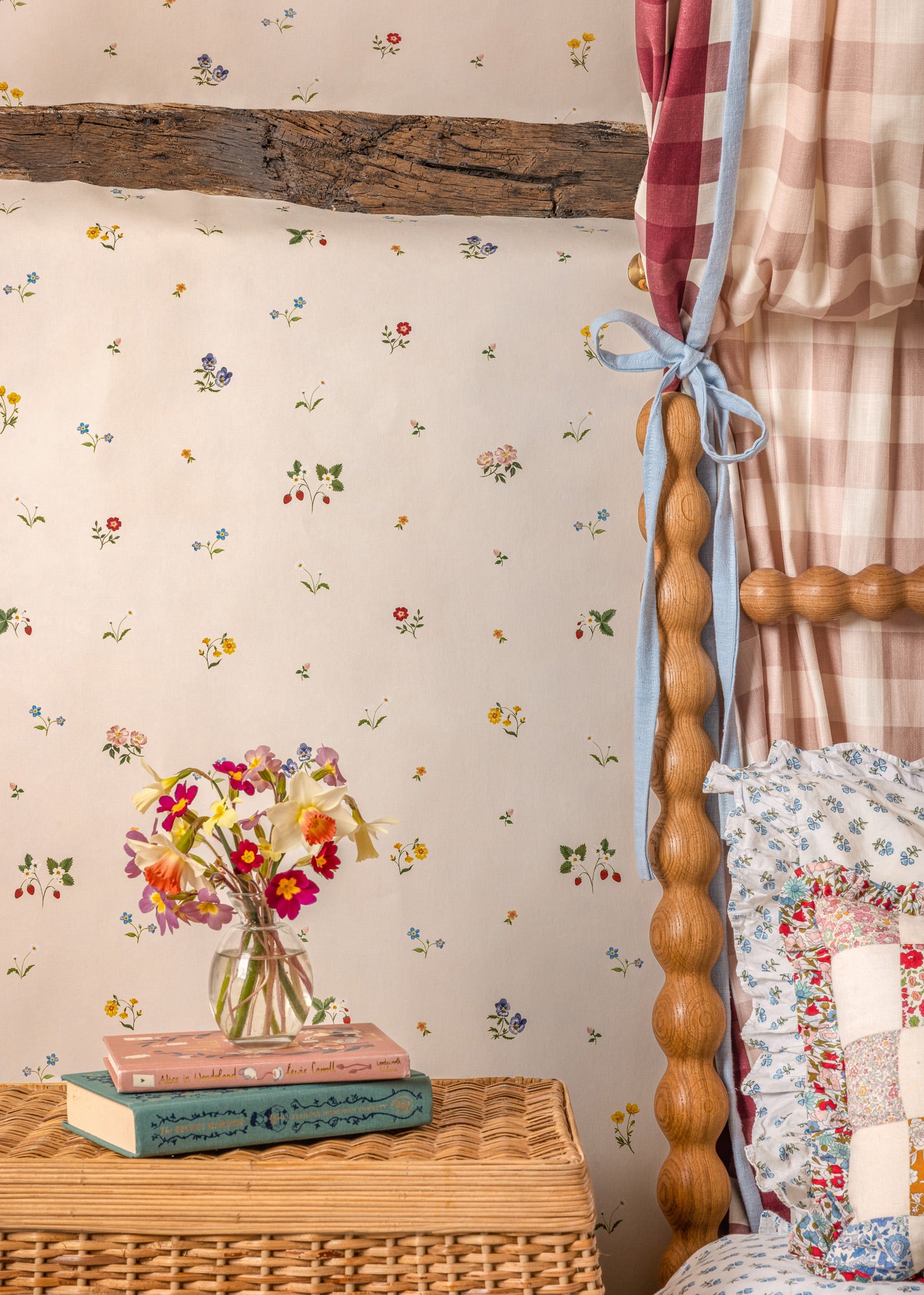 Herbarium Ditsy brings the joy and colour of an English country meadow and includes buttercups, daisies, forget-me-nots, strawberries and wild roses. Tess's original studies have been placed onto a warm lime wash ground, creating a charming ditsy floral wallpaper.