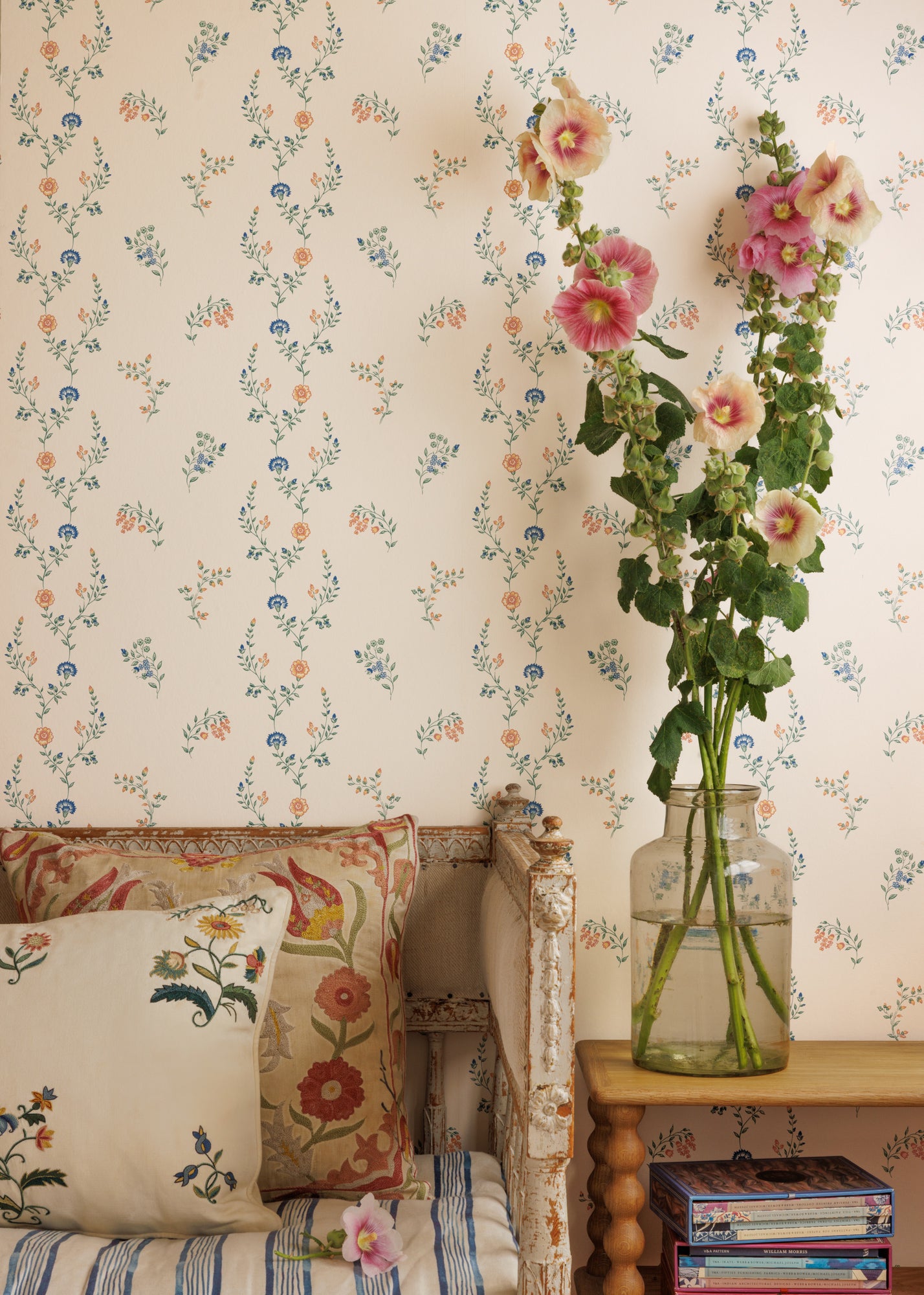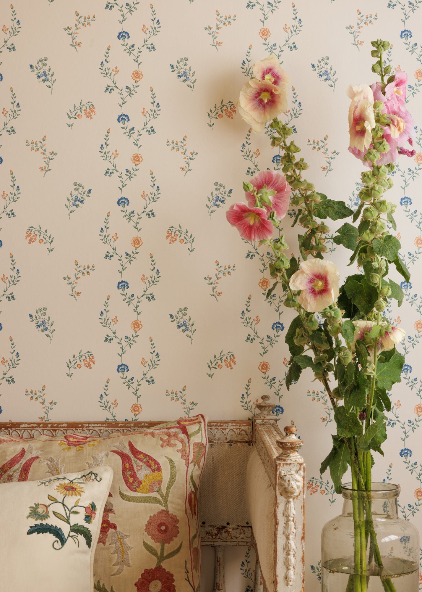 Inspired by motifs found on an 18th century fabric remnant, Indienne Vine draws inspiration from Indian painted bedspreads, or palampores, of the 18th and 19th century. Using a series of hand-painted florals, delicate vines and posies create a contemporary stripe. Indienne Vine is available in three colourways, each with its own distinct character.